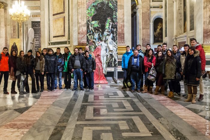 Στις 4 Δεκεμβρίου 2014 οι μαθητές της Γ’ Λυκείου είχαν την τιμή και τη χαρά να βρεθούν μαζί με τους πρώτους επισκέπτες στην έκθεση του παγκοσμίως γνωστού Έλληνα καλλιτέχνη, Νίκου Φλώρου, στην Αγία Πετρούπολη. Προετοιμάζοντας το πρόγραμμα της πολυήμερης εκδρομής τους στην Ρωσία, τα παιδιά έμαθαν με έκπληξη ότι τις ίδιες μέρες ένα από τα μεγαλύτερα μουσεία του κόσμου, ο καθεδρικός ναός του Αγίου Ισαακίου στην Αγία Πετρούπολη, θα φιλοξενήσει δύο απαράμιλλης ομορφιάς ψηφιδωτούς -ανάγλυφους πίνακες από χρωματιστό αλουμίνιο του Νίκου Φλώρου, τα οποία είναι εμπνευσμένα από τα έργα του Δομήνικου Θεοτοκόπουλου: «Ο Διαμερισμός των Ιματίων του Χριστού» και «Η Ανάσταση του Χριστού».