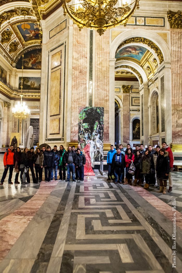Συνεπώς, η πρώτη προτεραιότητα των μαθητών ήταν να επισκεφθούν το μουσείο και έτσι ο Άγιος Ισαάκιος αποφασίστηκε ως πρώτος προορισμός της εκδρομής. Νωρίς-νωρίς μέσα στο χειμωνιάτικο και γκρίζο πρωινό της βόρειας πόλης τα Ελληνόπουλα μπήκαν στο επιβλητικό και λαμπερό μουσείο για να μείνουν άφωνα όχι μόνο από το πλούσιο διάκοσμο του χώρου, αλλά και από τους δυο ακτινοβόλους πίνακες του Έλληνα γλύπτη. Δεν θα μπορούσε κανείς να διαλέξει καλύτερο περιβάλλον για να τους αναδείξει. Τους μαθητές γέμισε με την υπερηφάνεια το γεγονός ότι ο Νίκος Φλώρος είναι ο πρώτος Έλληνας που εκθέτει στο σπουδαίο αυτό ιστορικό χώρο στη καρδιά της Αγίας Πετρούπολης. Προς μεγάλη έκπληξη της ομάδας, στον ίδιο χώρο βρέθηκε και ο φωτογράφος του καλλιτέχνη – ο Ηλίας Διαμαντάκος. Η χαρά ήταν αμοιβαία και αποτυπώθηκε σε ωραίες φωτογραφίες των μαθητών δίπλα στα λαμπρά και πρωτότυπα έργα τoυ συμπατριώτη τους.