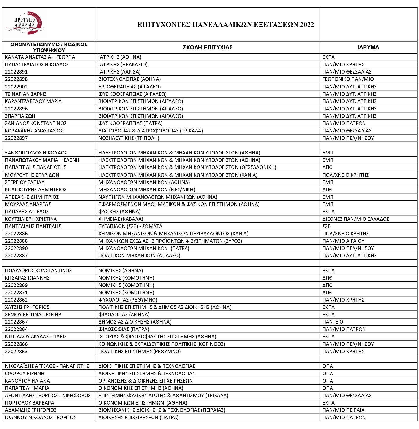 ΕΠΙΤΥΧΟΝΤΕΣ ΠΑΝΕΛΛΑΔΙΚΩΝ ΕΞΕΤΑΣΕΩΝ 2022