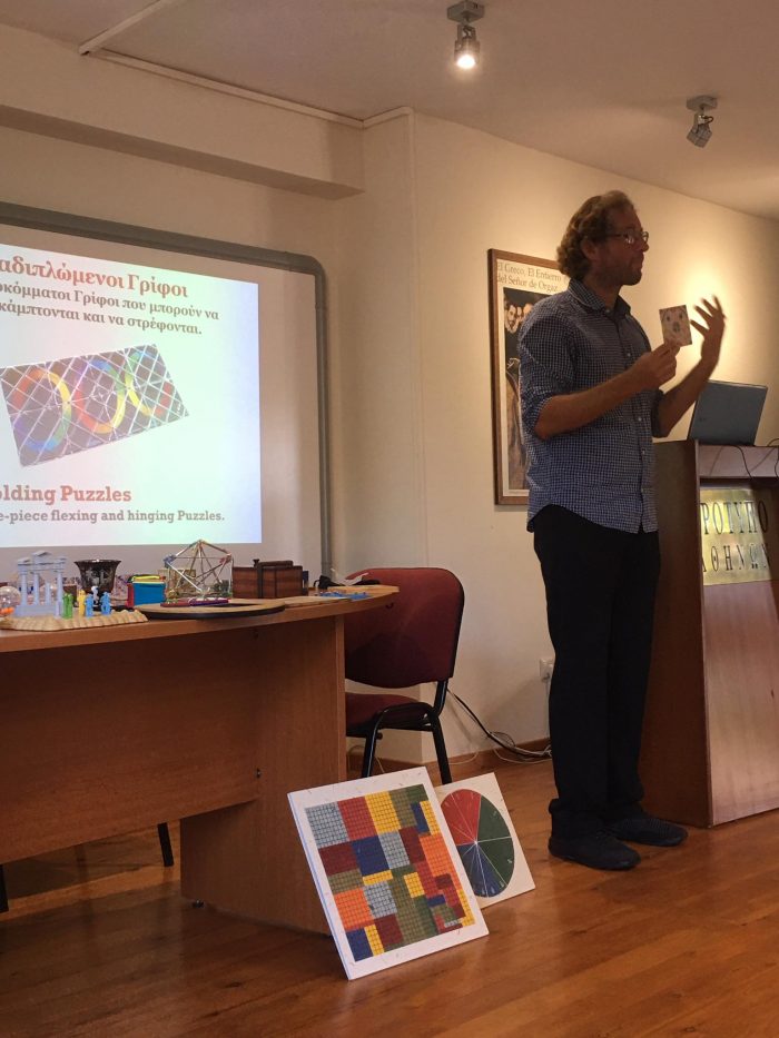 Αρχικά, μίλησε στους μαθητές για τη μαγεία των γρίφων, ομολογώντας ότι καθένας από αυτούς είναι ένα διαφορετικό άθλημα για το μυαλό, το οποίο, πολλές φορές, αναφέρεται σε τρισδιάστατα λογικά και εκπαιδευτικά παιχνίδια. Ερωτώμενος από τους μαθητές για τα είδη των γρίφων απάντησε ότι υπάρχουν οι ταιριστικοί γρίφοι, οι ακολουθιακοί, οι αναδιπλούμενοι, οι εμπλεκόμενοι, οι διασυνδεδεμένοι, οι ανοιγόμενοι, οι εκλειπόμενοι κ.ά. Τόνισε, ακόμα, ότι οι Έλληνες έχουμε μια τεράστια παράδοση από γρίφους, με επιτομή το Οστομάχιον (μάχη των οστών) του Αρχιμήδη, που αποτελεί και τον πρώτο καταγεγραμμένο γρίφο στην ιστορία της ανθρωπότητας.