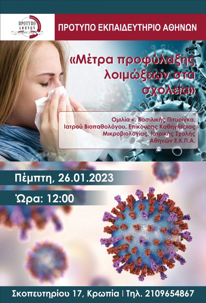 Ομιλία κ. Βασιλικής Πιτυρίγκα , Ιατρού Βιοπαθολόγου, Επίκουρης Καθηγήτριας Μικροβιολογίας Ιατρικής Σχολής Αθηνών Ε.Κ.Π.Α. με θέμα : «Μέτρα προφύλαξης λοιμώξεων στα σχολεία»