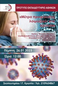 Ομιλία κ. Βασιλικής Πιτυρίγκα , Ιατρού Βιοπαθολόγου, Επίκουρης Καθηγήτριας Μικροβιολογίας Ιατρικής Σχολής Αθηνών Ε.Κ.Π.Α. με θέμα : «Μέτρα προφύλαξης λοιμώξεων στα σχολεία»ssssprotipo_athPosted: Jan 26th, 2023In: Latest News, Mας επισκέφθηκαν Read More about Ομιλία κ. Βασιλικής Πιτυρίγκα , Ιατρού Βιοπαθολόγου, Επίκουρης Καθηγήτριας Μικροβιολογίας Ιατρικής Σχολής Αθηνών Ε.Κ.Π.Α. με θέμα : «Μέτρα προφύλαξης λοιμώξεων στα σχολεία»