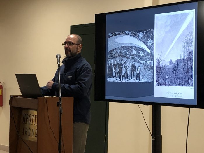 Λίγο μετά τις 19:00 το απόγευμα, ξεκίνησε η «μύηση» των παρευρισκομένων στην επιστήμη της Αστρονομίας. Είναι γνωστό ότι, καθημερινά, η Γη βομβαρδίζεται από τόνους μικρομετεωριτών, σκόνης και πάγου εξωγήινης προέλευσης, ενώ υπάρχουν εκατομμύρια μικρά και μεγάλα παγόβουνα που κινούνται σχεδόν χαοτικά σε μια ακτίνα έως και ενός έτους φωτός μακριά από τον Ήλιο. Αυτά τα σώματα είναι ψήγματα της πρωταρχικής ύλης που δημιούργησε το Ηλιακό μας Σύστημα. Όταν κάποιο από αυτά κινηθεί προς τον Ήλιο, αρχίζει να θερμαίνεται, με αποτέλεσμα τη βαθμιαία εξάχνωση του υλικού από το οποίο αποτελείται. Η δημιουργία μιας ουράς ύλης που ακολουθεί το παγωμένο αυτό σώμα δίνει τη χαρακτηριστική και γνωστή σε όλους μας όψη ενός κομήτη.
